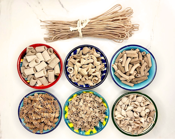 Inside you’ll find one bag each of Einkorn Gigli Rigati, Spelt and Fava Bean Sedani Rigati, Spelt Conchiglie, Spelt and Wrinkled Peas Fusilli, Rivet Rigatoni, Einkorn Ditalini and Krivet Spaghettoni.